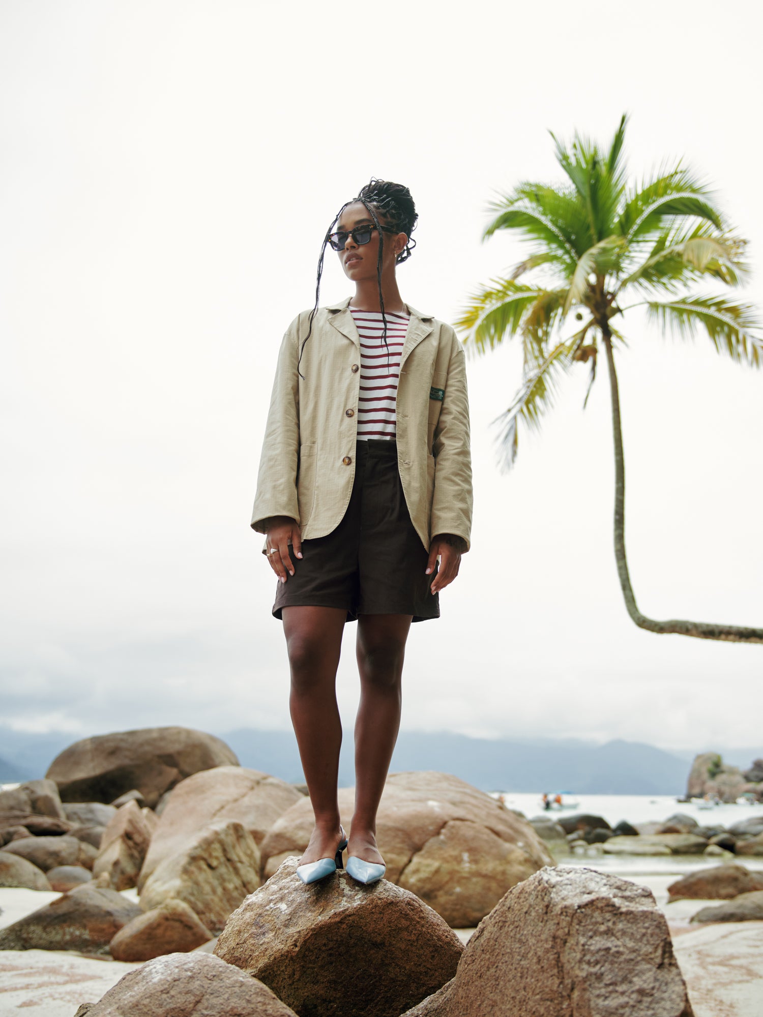 Bermuda estilo alfaiataria com prega dupla, corte amplo e levemente mais curta, garantindo elegância e conforto.