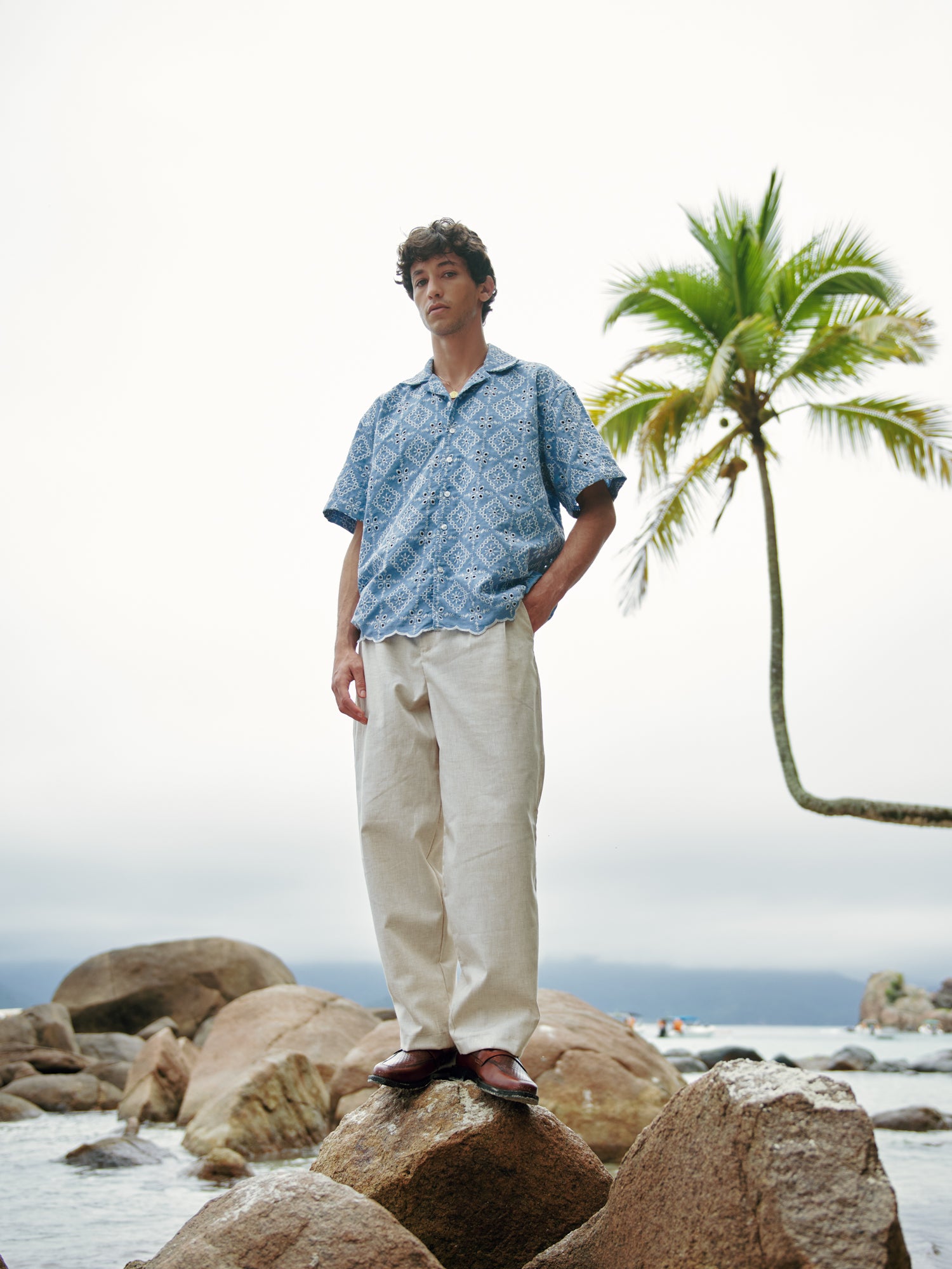 Calça estilo alfaiataria com prega dupla, corte amplo, garantindo maior conforto e elegância. Seu tecido de cor off white apresenta visual rústico, já que sua trama possui pequenas ranhuras na cor crua. A calça é ideal para compor outfits mais elegantes que combinam praticamente com qualquer parte de cima do seu armário.