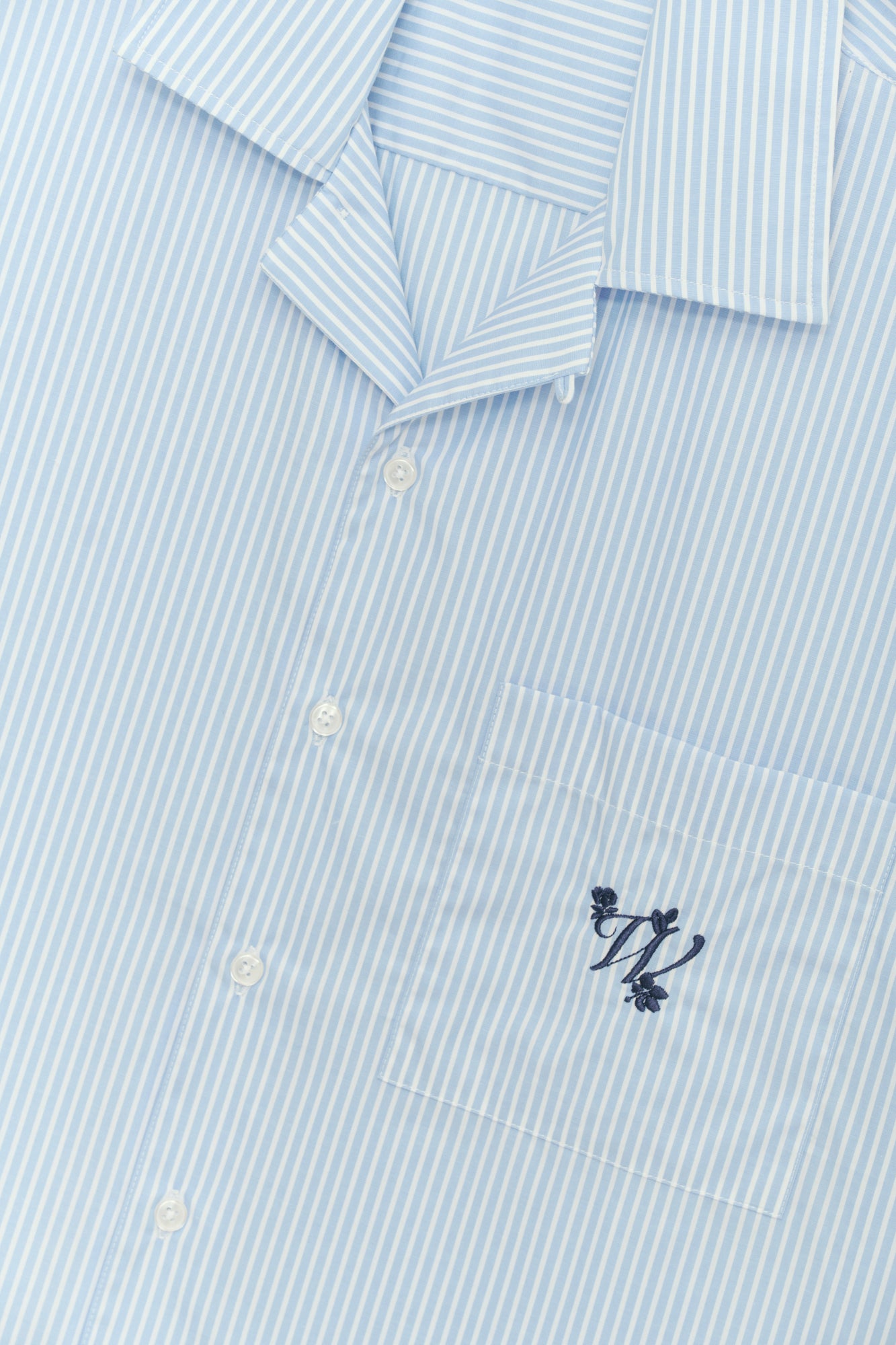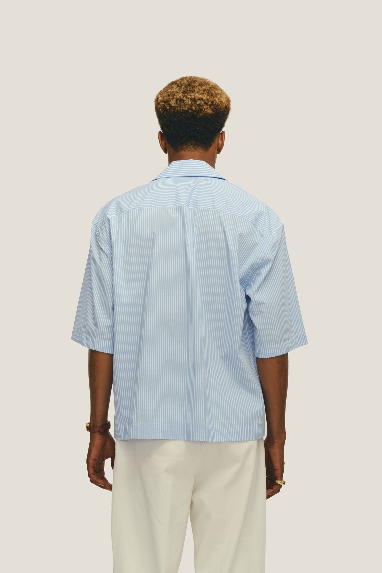 Camisa de botão com modelagem Boxy (mais curta que o tradicional) e gola cubana estruturada. Tecido fresco 100% algodão em listras azul e branco. Possui um bolso frontal no bolso esquerdo com bordado Welcome centralizado. Perfeito para ser usada tanto aberta quanto fechada, de dia ou em ocasiões especias, a noite.