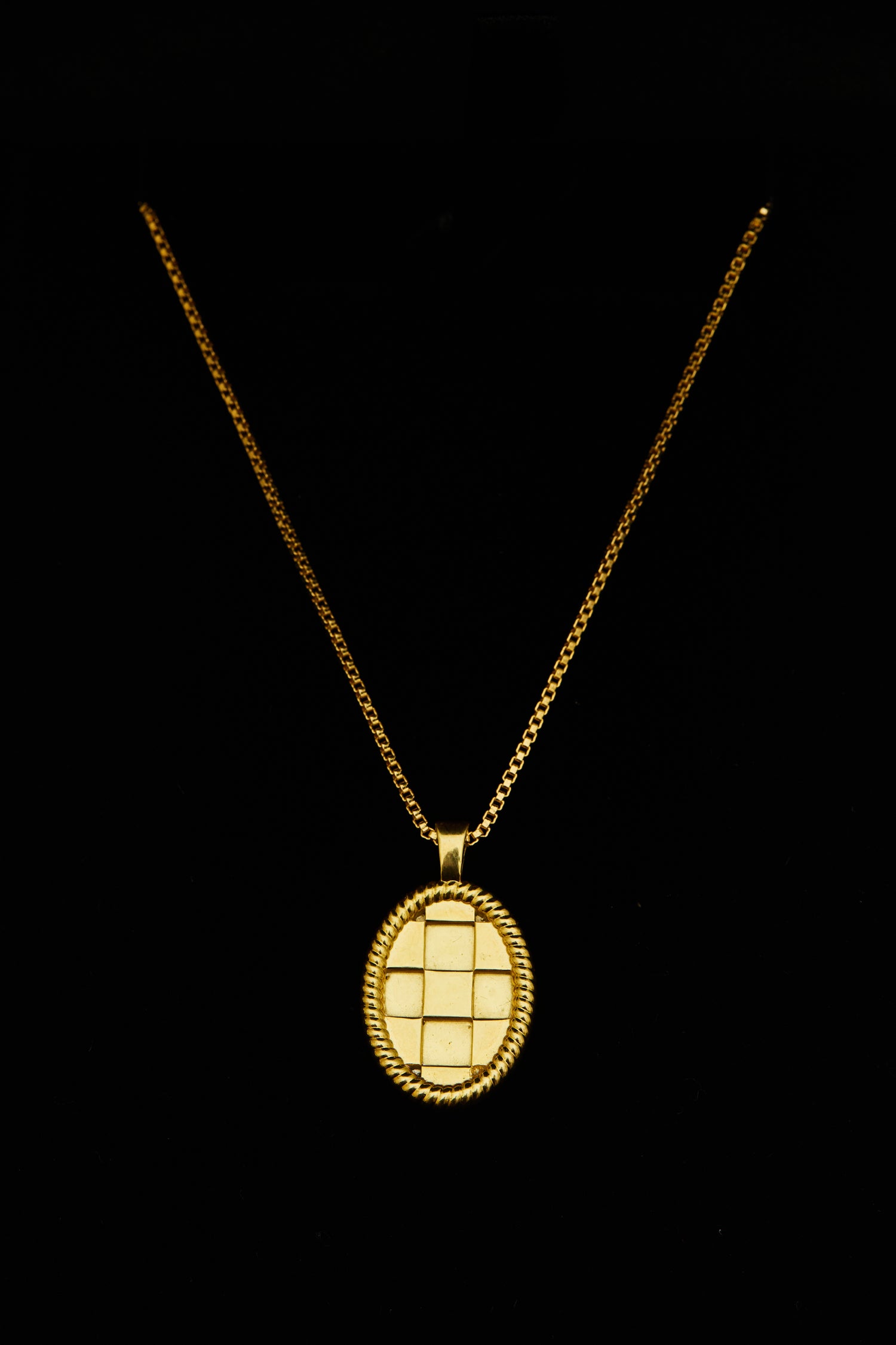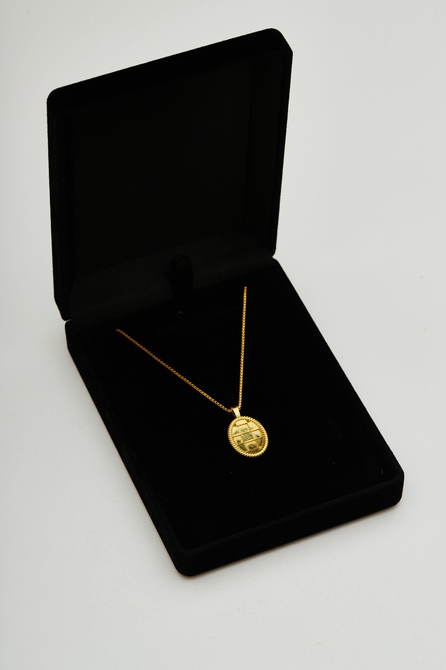 O pingente da Welcome tem formato de medalha e é feito manualmente no Rio de Janeiro com matéria prima nobre como a prata 925. Seu design reflete sobre a textura "checked", quadriculado comumente usado em produtos da marca, sugerindo luxo e qualidade. O trançado por volta da medalha faz referência aos amuletos antigos, que eram ricos em detalhes e prezam pela estética. Disponível também na versão prata.
