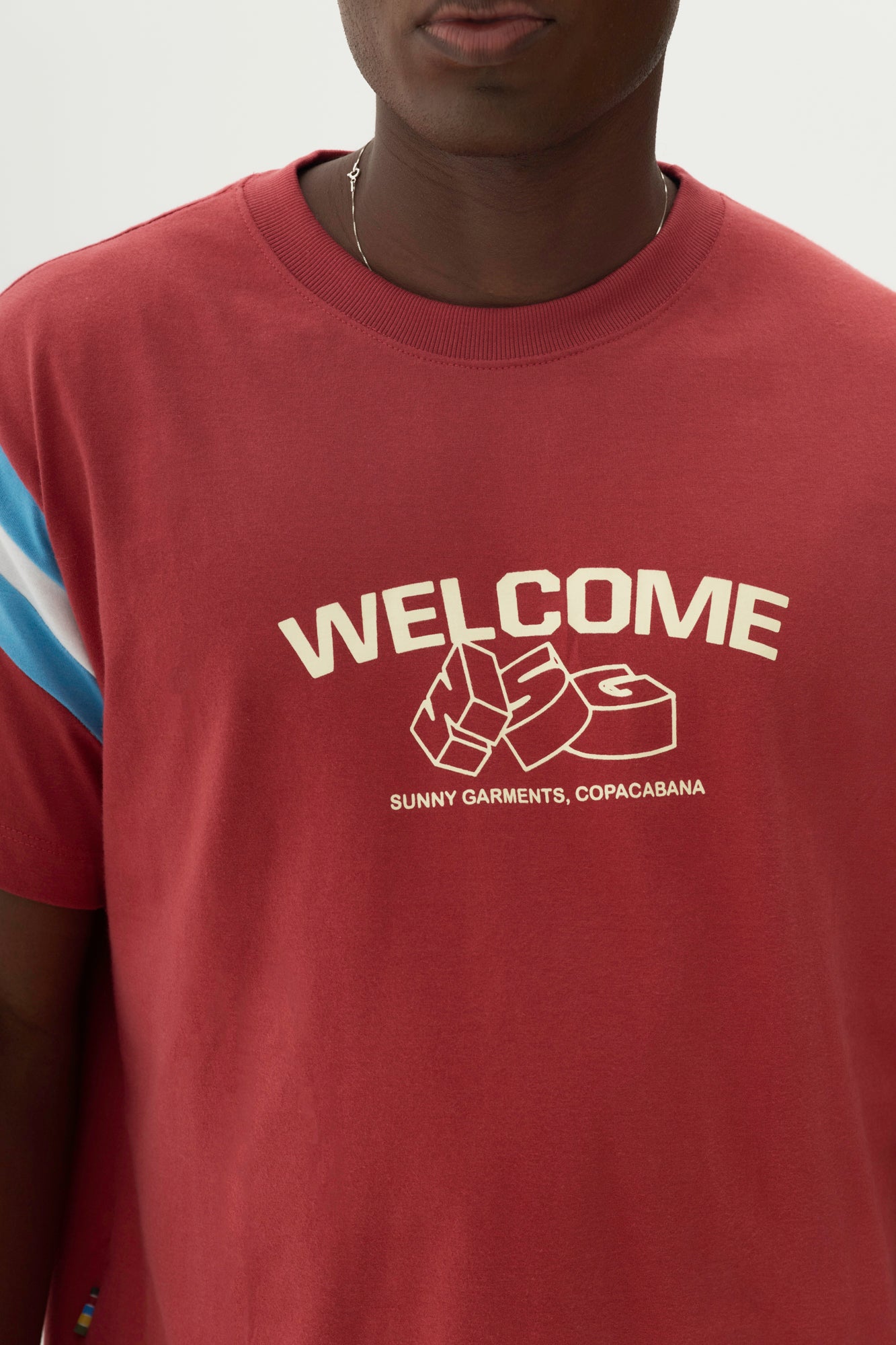 T-Shirt com modelagem levemente boxy e malha de algodão com toque peletizado. Corte mais amplo com comprimento mais curto e ombro deslocado. Vale ressaltar o recorte das listras no ombro, nas cores azul e branco com inspiração no universo vintage. Sua arte no peito é feita em serigrafia na cor off white.