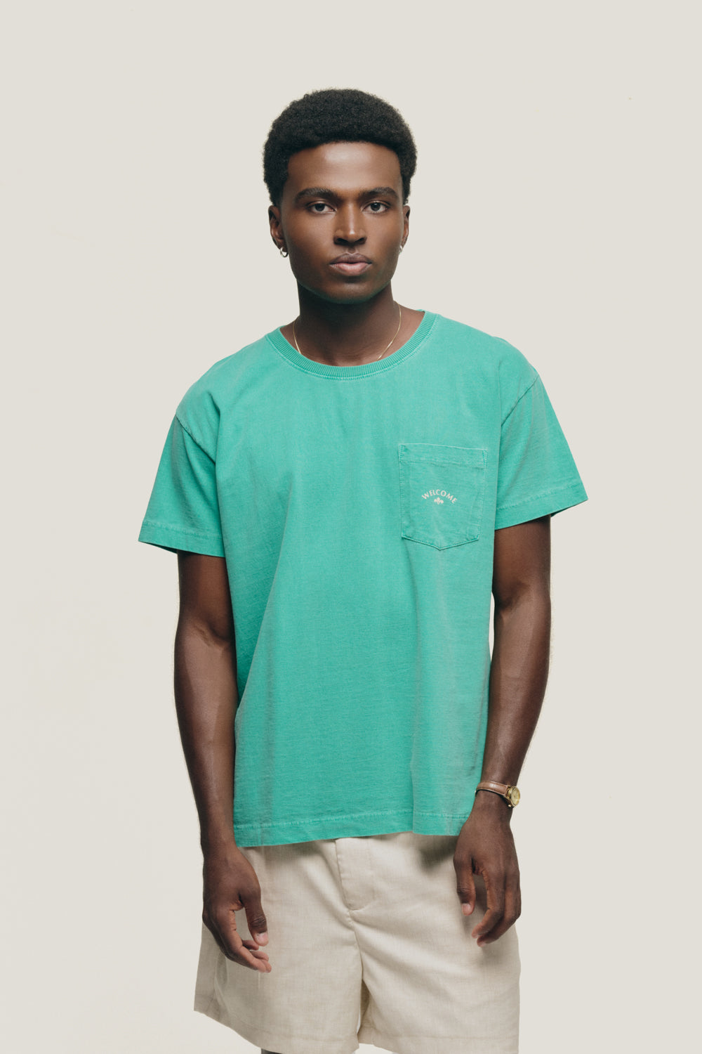 T-shirt com modelagem tradicional, malha estonada e caimento confortável. São 4 opções de cores de camisetas: verde, cinza, lilás e magenta, todas com bolso no peito, onde recebe um silk assinando a marca.